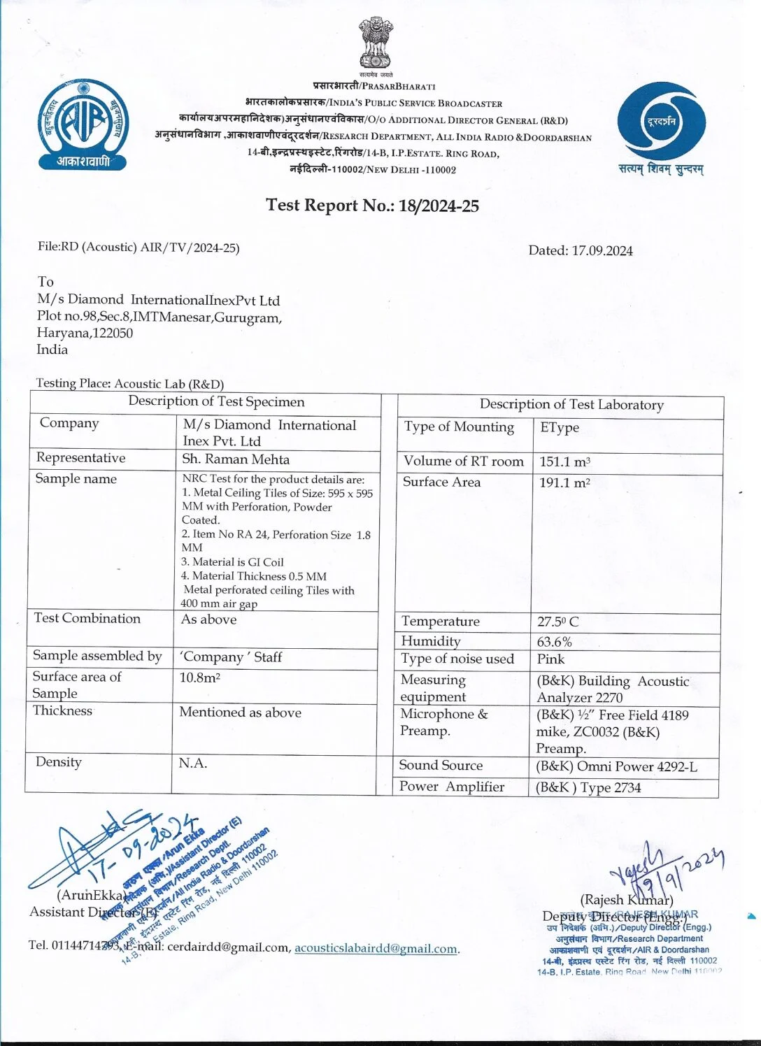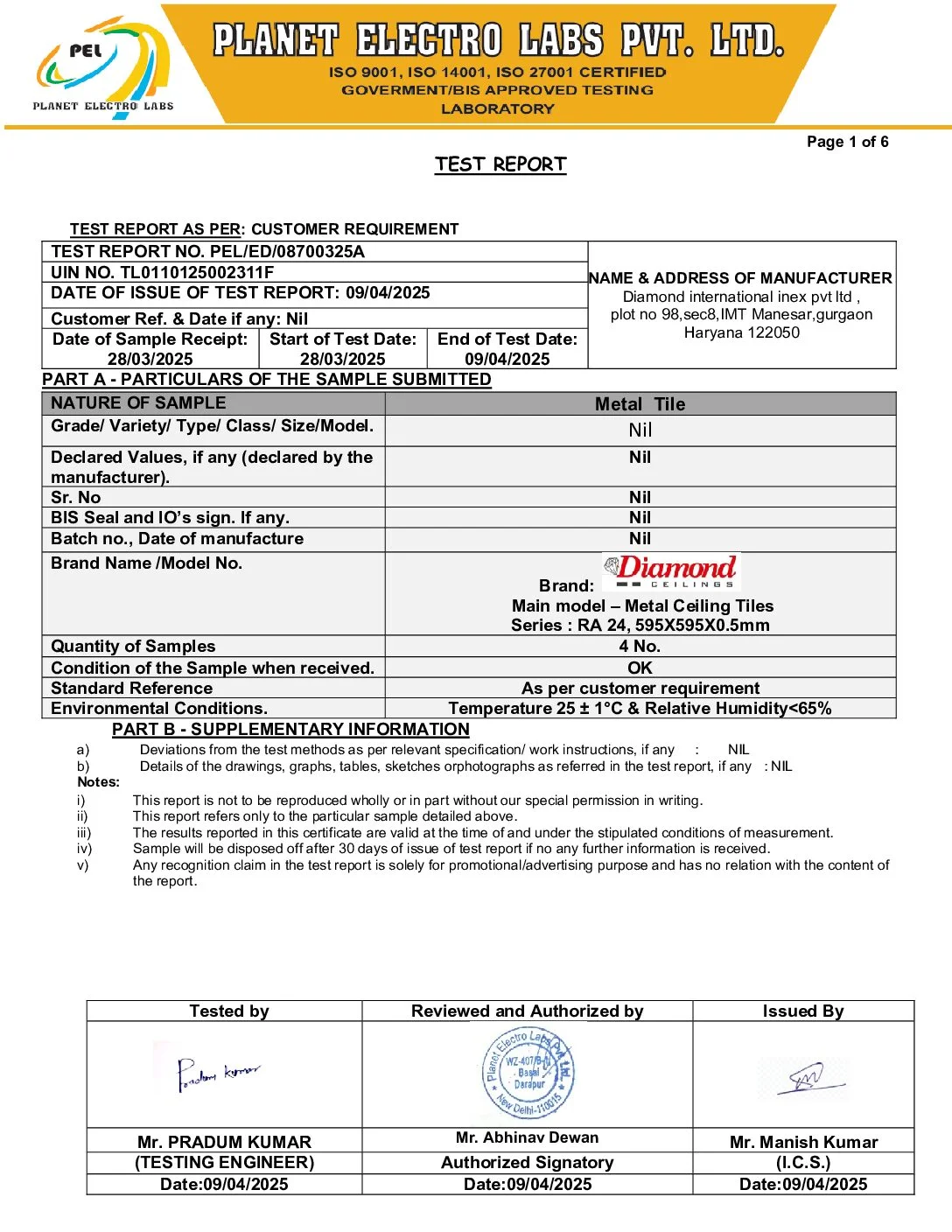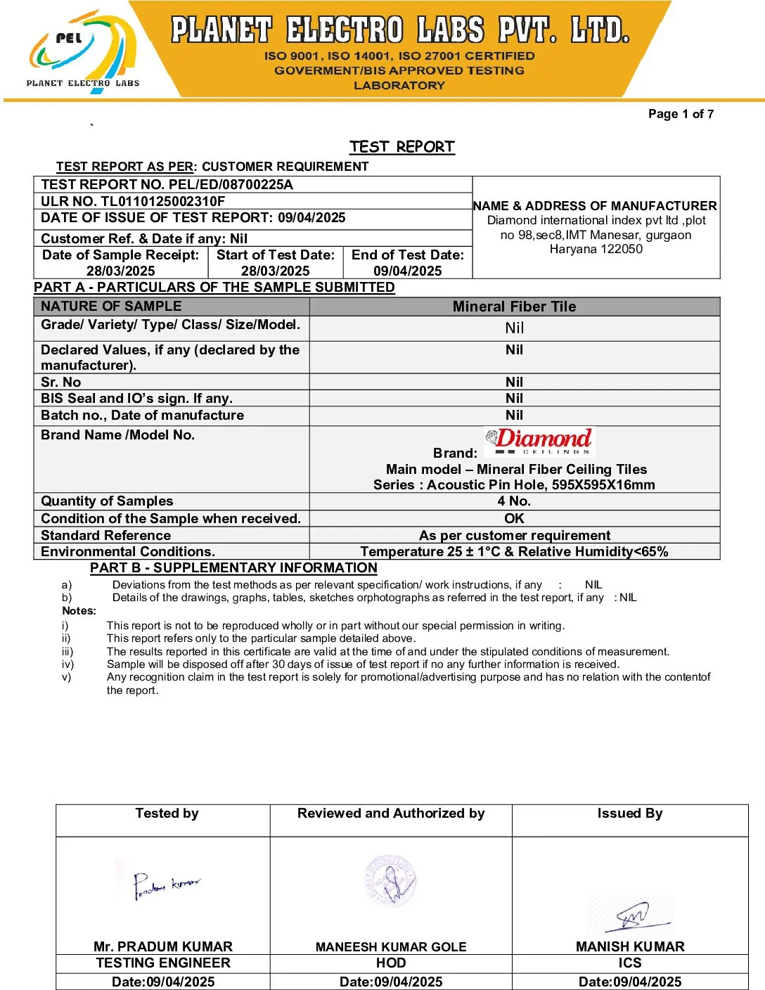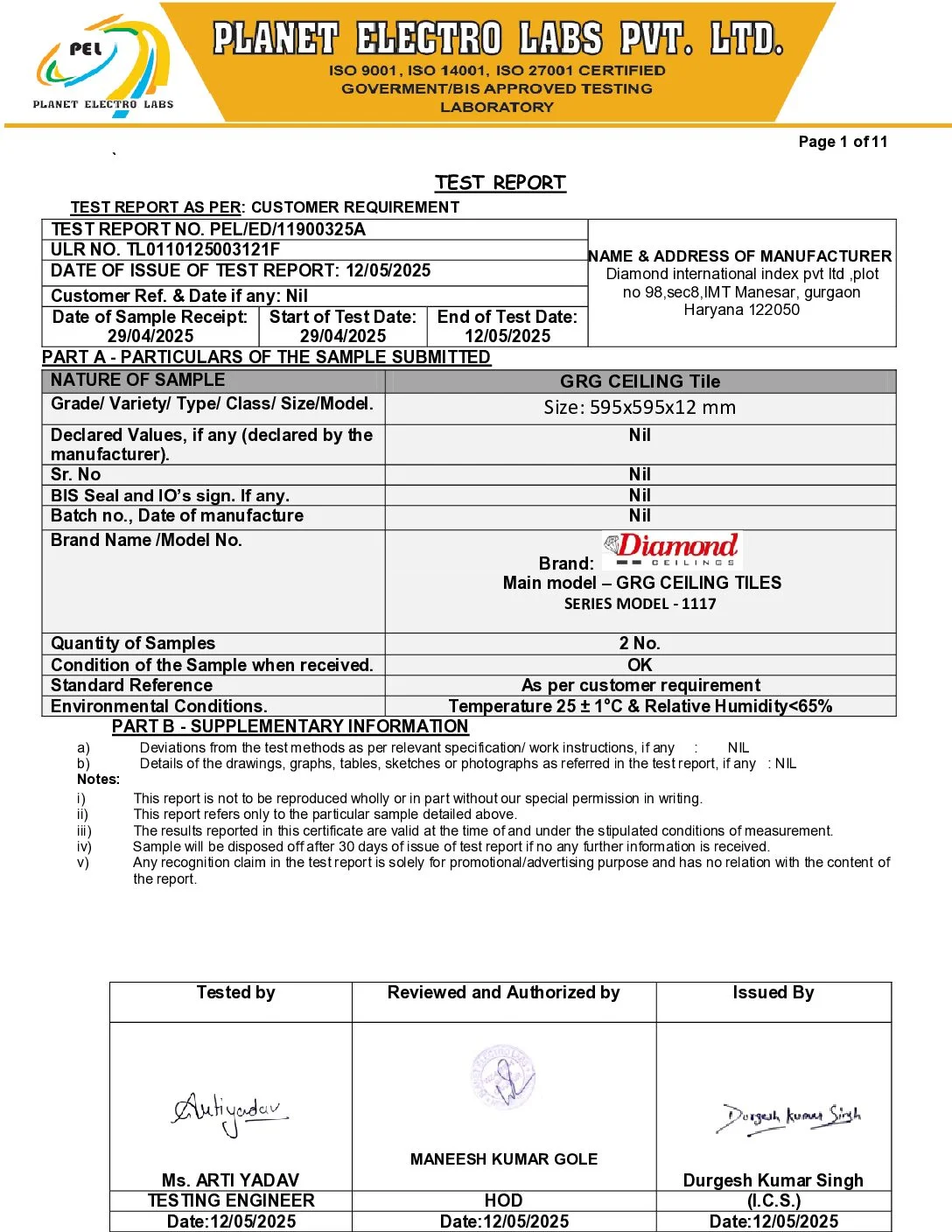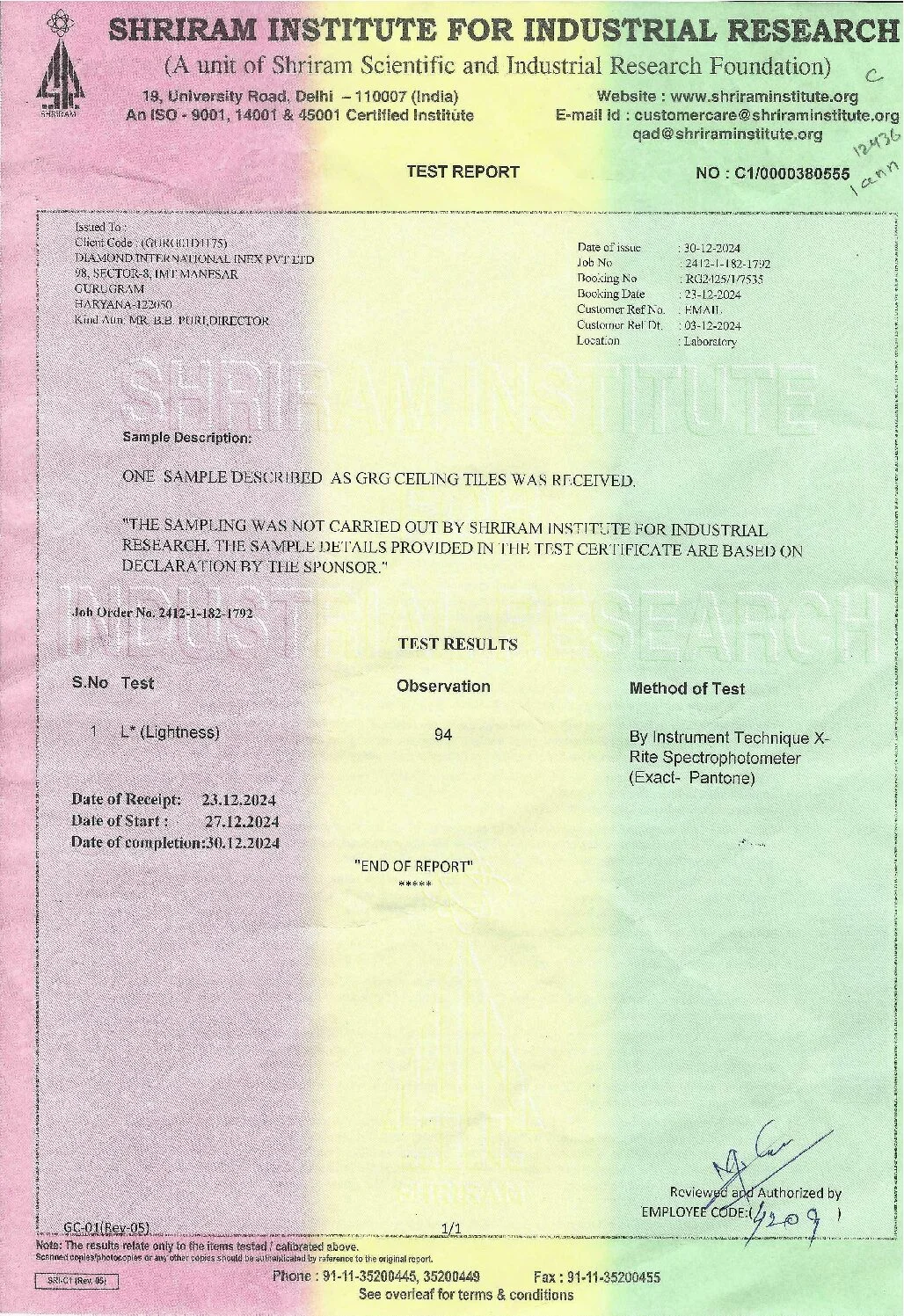 At Diamond Ceilings, we take Certifications & Quality Standards seriously - each of our product categories is backed by certifications relevant to its material performance and intended use. Our GRG ceiling tiles hold the most extensive list of approvals, including CPWD and MES approvals, BIS certification, and independent testing for non-combustibility, acoustic performance (NRC), humidity resistance (RH 99), and light reflectance. Metal ceiling tiles are CPWD-approved and tested for thickness, DFT, and acoustic NRC compliance. Our Mineral Fiber range is certified for non-combustibility, light reflectance, humidity resistance, and acoustic absorption. The GI suspension system is internally tested and certified for load performance. At the corporate level, our parent company, Diamond International Inex Pvt. Ltd., is proud to be IGBC-certified, supporting green building standards in India.