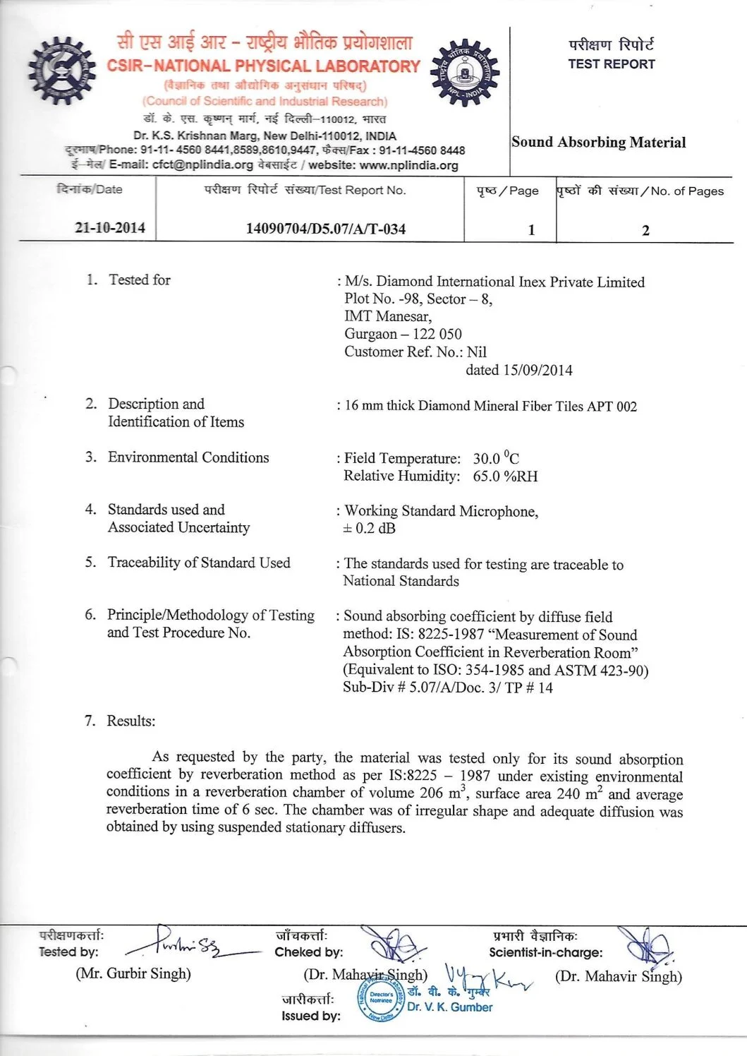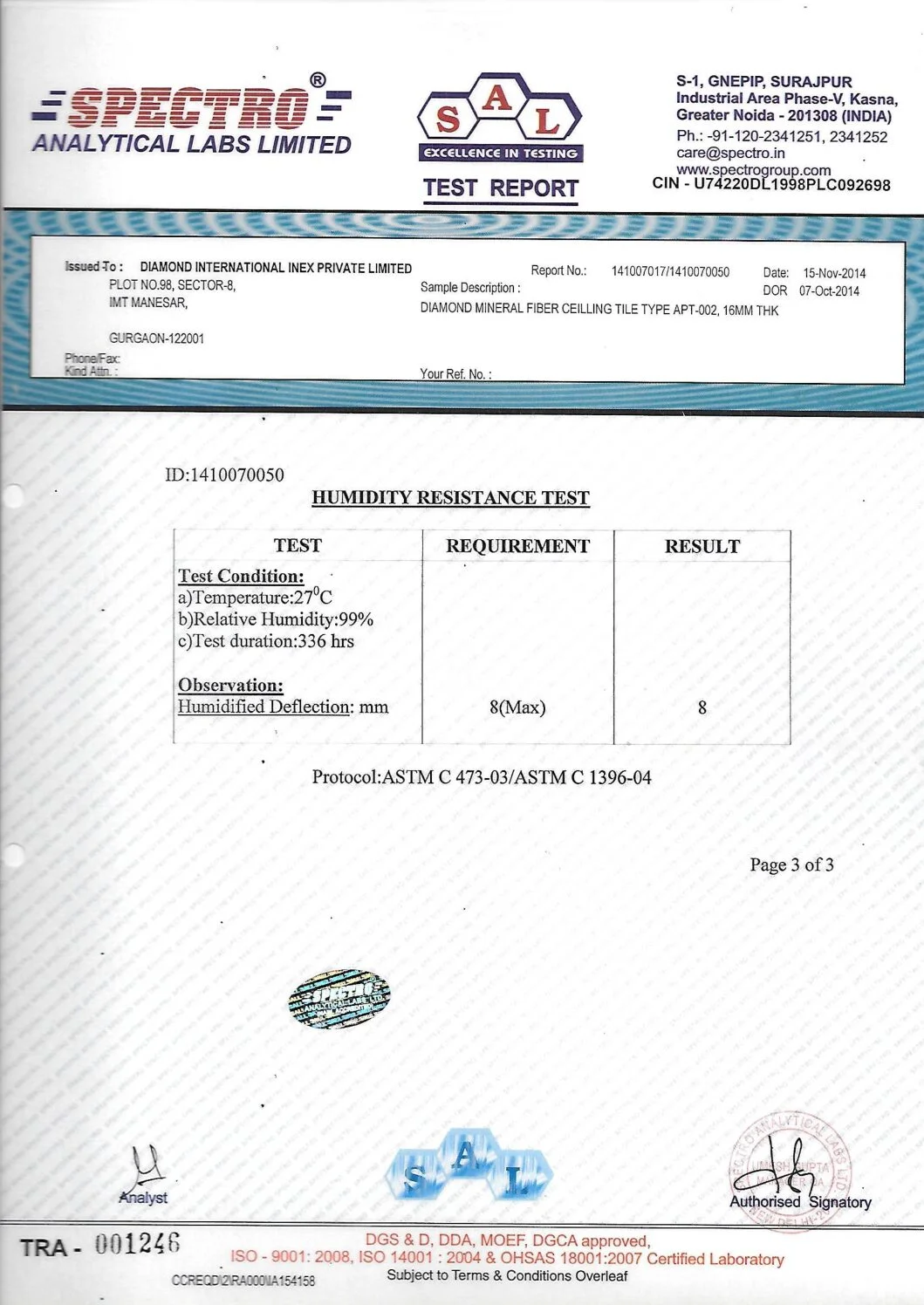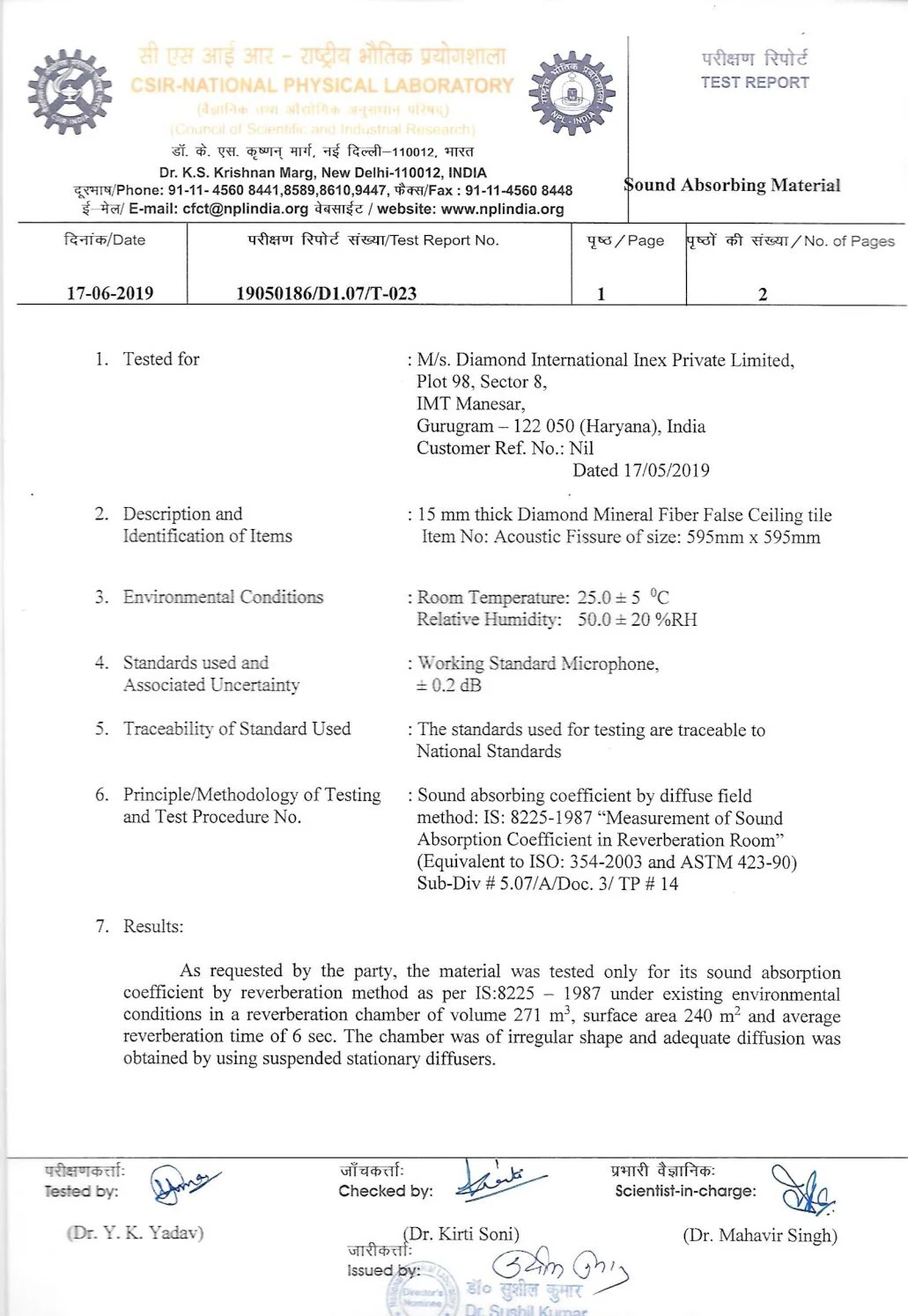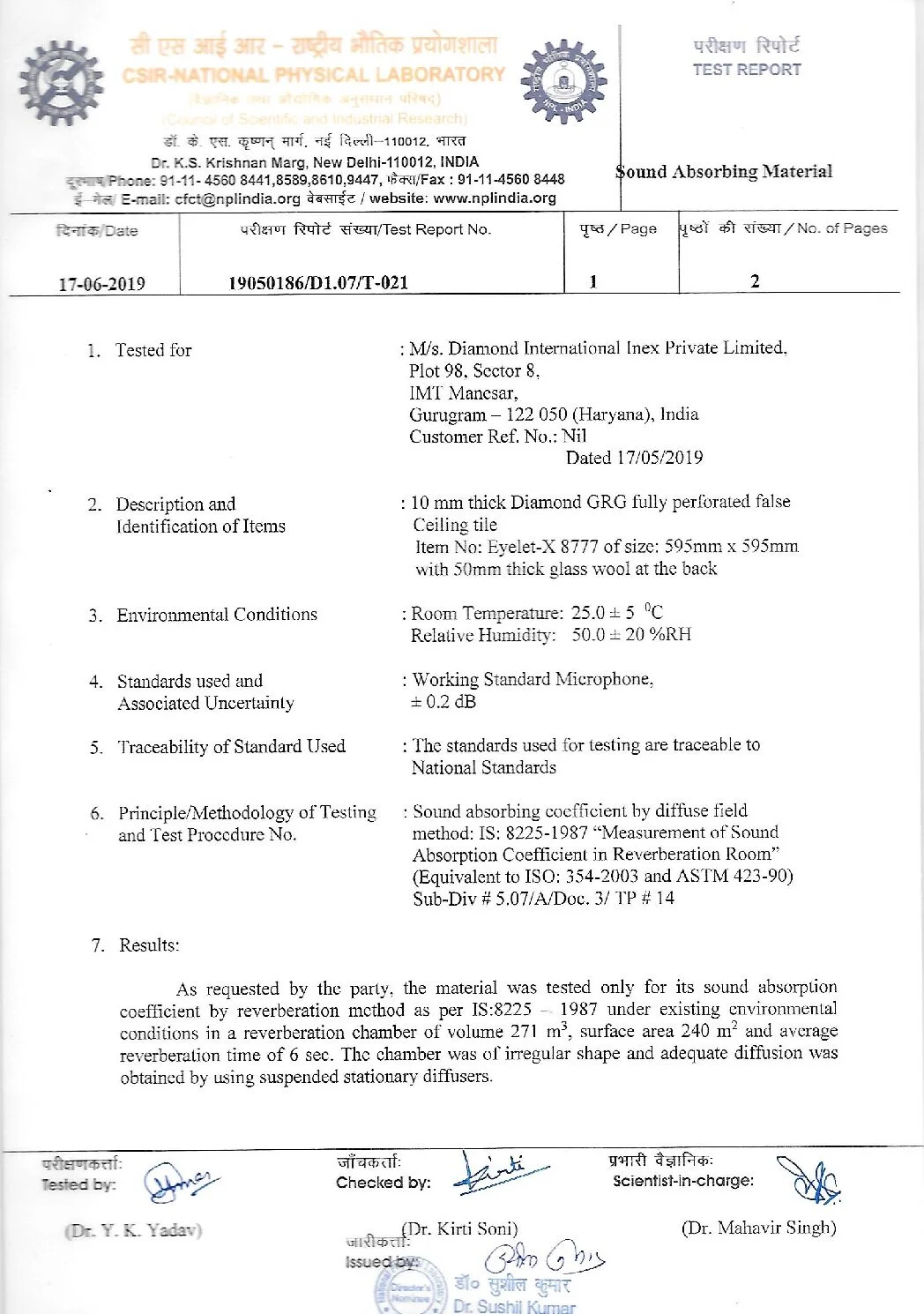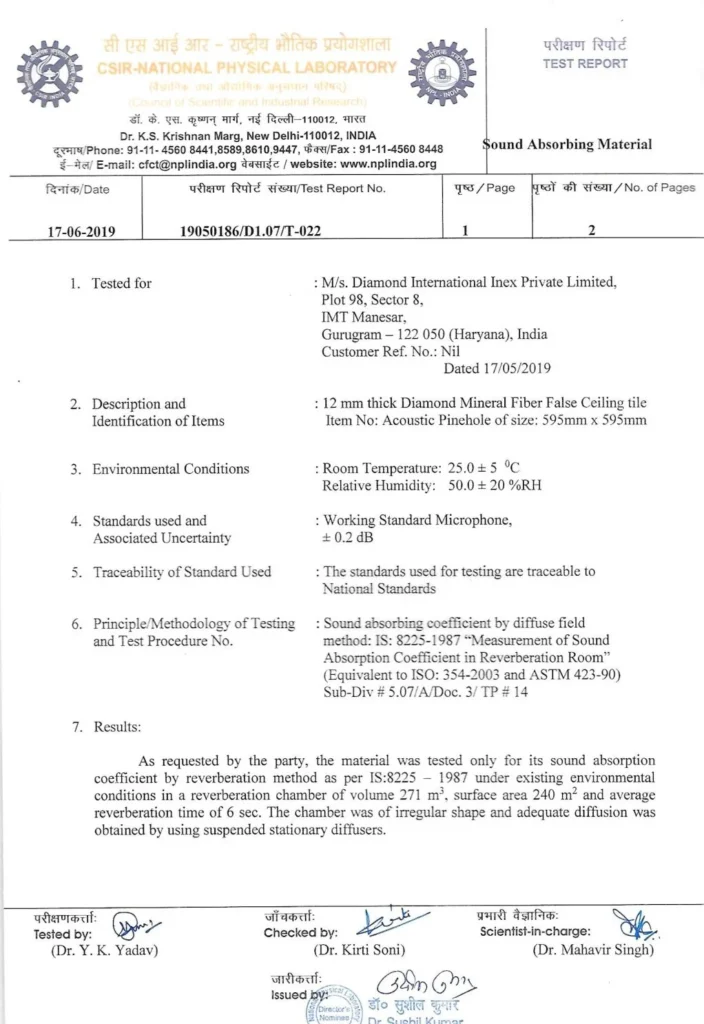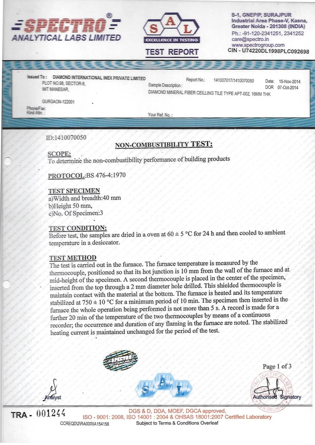 At Diamond Ceilings, we take Certifications & Quality Standards seriously - each of our product categories is backed by certifications relevant to its material performance and intended use. Our GRG ceiling tiles hold the most extensive list of approvals, including CPWD and MES approvals, BIS certification, and independent testing for non-combustibility, acoustic performance (NRC), humidity resistance (RH 99), and light reflectance. Metal ceiling tiles are CPWD-approved and tested for thickness, DFT, and acoustic NRC compliance. Our Mineral Fiber range is certified for non-combustibility, light reflectance, humidity resistance, and acoustic absorption. The GI suspension system is internally tested and certified for load performance. At the corporate level, our parent company, Diamond International Inex Pvt. Ltd., is proud to be IGBC-certified, supporting green building standards in India.