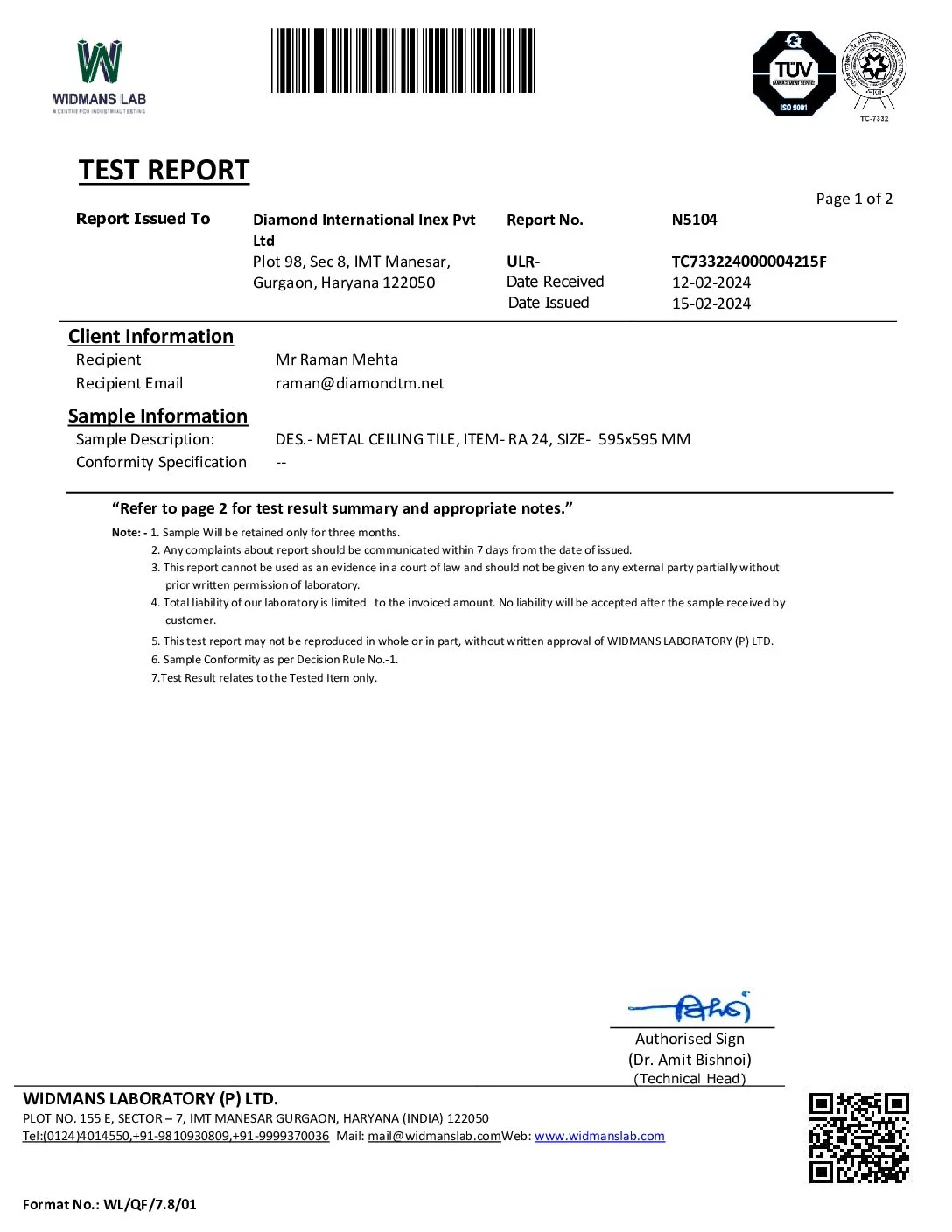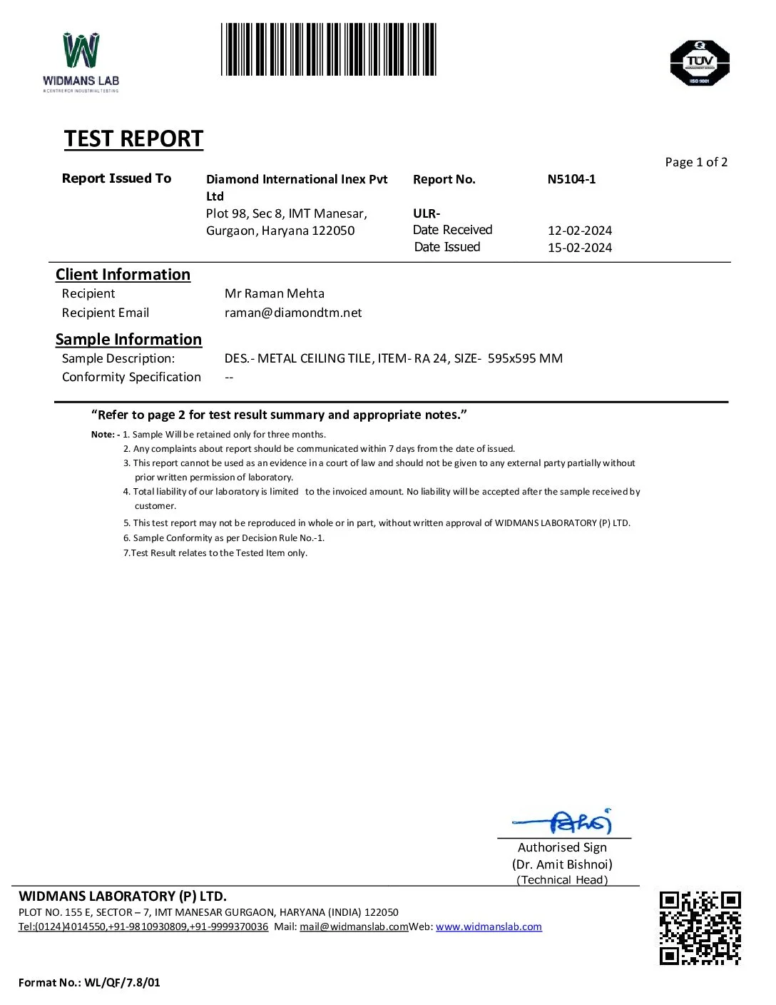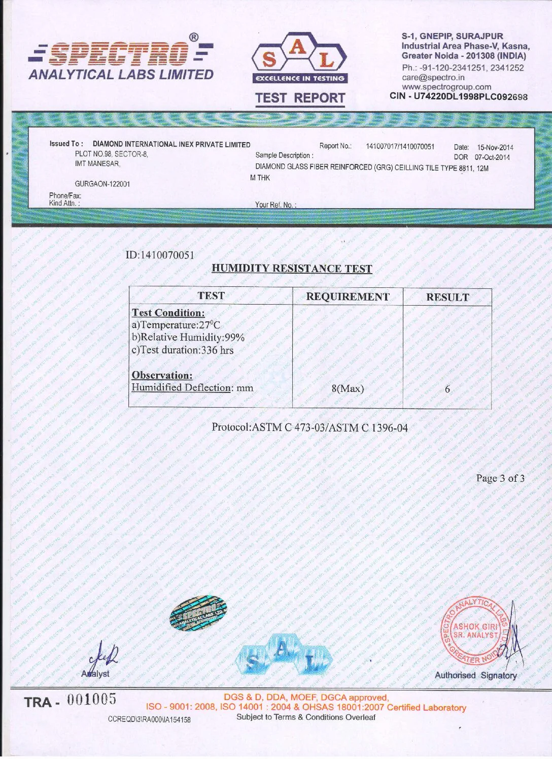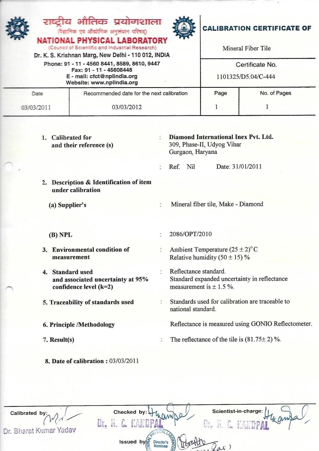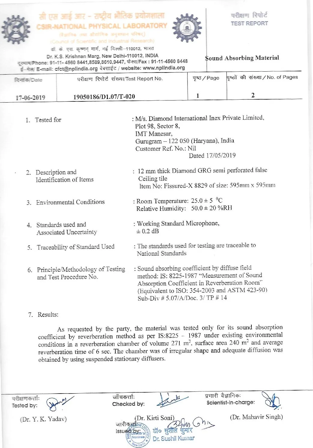 At Diamond Ceilings, we take Certifications & Quality Standards seriously - each of our product categories is backed by certifications relevant to its material performance and intended use. Our GRG ceiling tiles hold the most extensive list of approvals, including CPWD and MES approvals, BIS certification, and independent testing for non-combustibility, acoustic performance (NRC), humidity resistance (RH 99), and light reflectance. Metal ceiling tiles are CPWD-approved and tested for thickness, DFT, and acoustic NRC compliance. Our Mineral Fiber range is certified for non-combustibility, light reflectance, humidity resistance, and acoustic absorption. The GI suspension system is internally tested and certified for load performance. At the corporate level, our parent company, Diamond International Inex Pvt. Ltd., is proud to be IGBC-certified, supporting green building standards in India.
