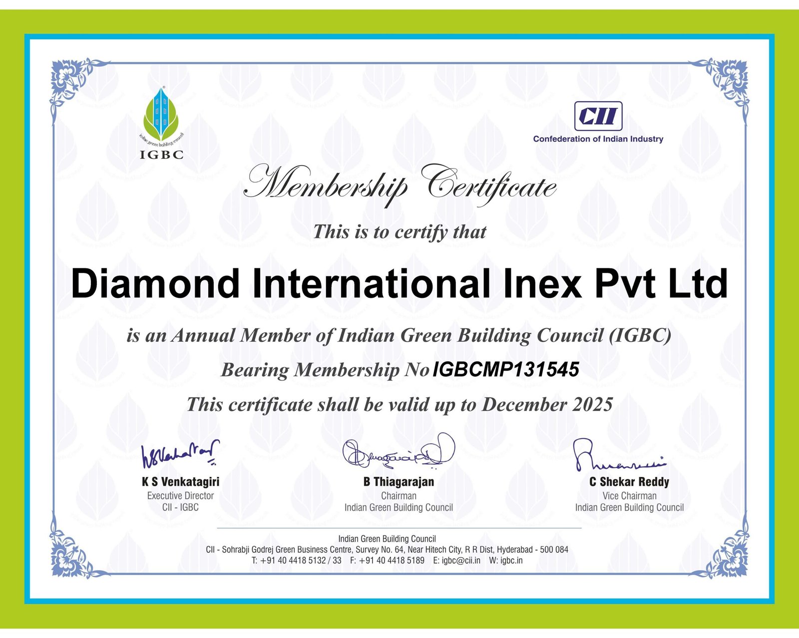 Diamond Ceilings is recognised by the Indian Green Building Council (IGBC) for contributing to sustainable construction practices. As part of our parent company, Diamond International Inex Pvt Ltd, we are proud to support India’s green building movement by offering ceiling products that meet IGBC’s eco-performance standards. From low-emission materials to recyclable components, our manufacturing practices are aligned with environmental responsibility, making us a reliable partner for green-certified projects across India.